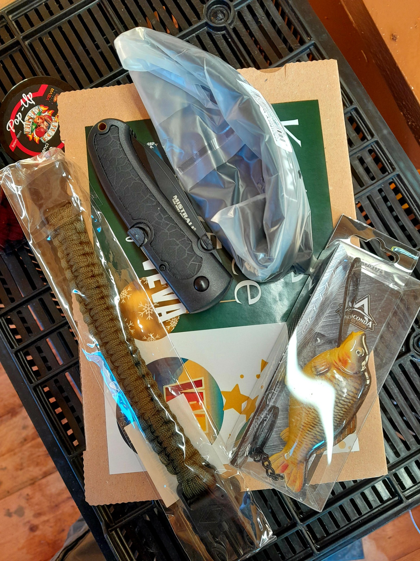 Krásný zavírací nůž! Paracord náramek přežití! Polarizační brýle, které ocení každý rybář a krásný otvírák na pivo v podobě velkého šupináče.